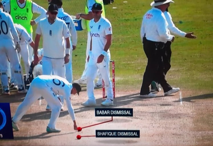During the drinks break of the second session, Joe Root and Robinson were seen discussing how they got rid of Babar. During their chat, Root did something extraordinary, predicting the exact same pitch point where Robinson bowled, turning back sharply to knock over Babar.