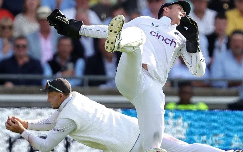 As if the ball was going to get away from every fielder, Joe Root, at first slip, launched himself into an audacious chase. His view obscured by the keeper’s outstretched glove, Root backed-pedaled and timed his dive to perfection. In a moment that was almost incredulous, he plucked up the ball out of thin air with a one-handed, low grab to his right.