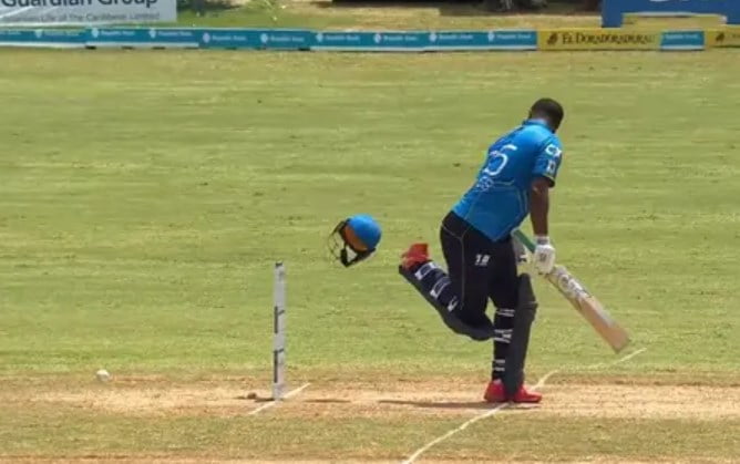 Johnson Charles almost dismissed by his own helmet! @BetBarteronline magic moment!#CPL23 #SLKvTKR #BetBarter pic.twitter.com/Ts6YxZY1m0— CPL T20 (@CPL) August 26, 2023