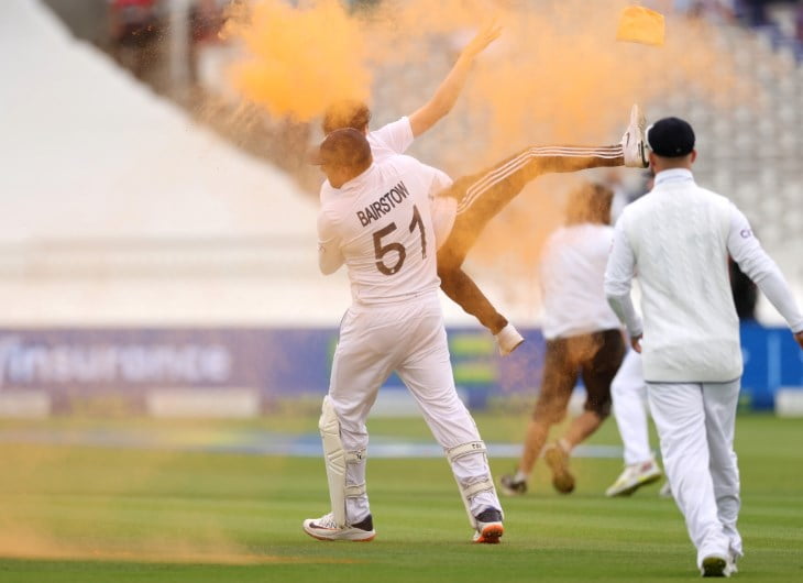 England wicket-keeper Jonny Bairstow found himself in the midst of an unexpected incident during the second Ashes Test at Lord’s. Just minutes into the match, Bairstow took it upon himself to remove a protester from the ground. The protester, associated with the Just Stop Oil campaign, had released orange paint near the wicket before being carried off the field by Bairstow. The incident caused a delay as the grounds staff had to repair the affected area of the pitch. In the process, Bairstow also got paint on his whites and had to change his shirt.