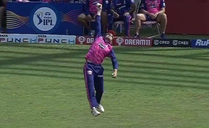 What a blinder this from Jos Buttler. Absolutely terrific catch to end the innings of an in-form batter.#CricketTwitter #IPL2022 #IPL #rrvspbks