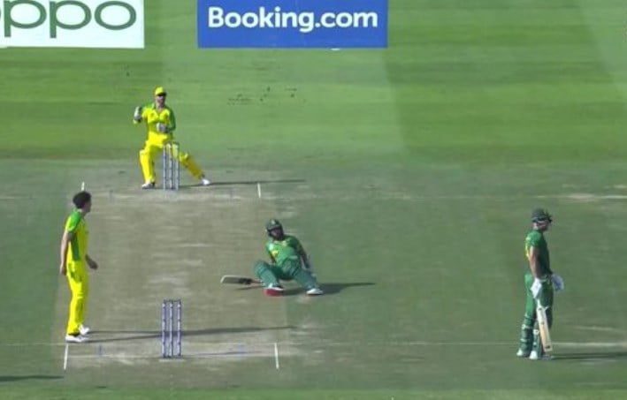 On the third ball of the over 15th over, Markran stabbed the ball towards point, but the fielder caught it and failed to hit teh sumps at the non-striker’s end. Maharaj wanted to run on the overthrow but Markram’s got his back turned on him as he was stretching to get back from the previous throw. Maharaj has hared down halfway on the pitch and then slips as he looks to turn back.