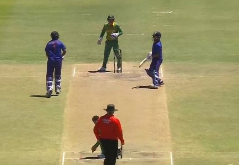 After a cautious start, Dhawan and Virat Kohli were dismissed in quick succession which left India reeling at 64/2 at the end of 14 overs. Rishabh Pant came out to bat after the dismissal of Kohli and on the last ball of the 15th over bowled by Keshav Maharaj, a comedy of errors almost cost India the wicket of KL Rahul.