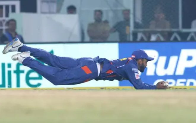 Sensation fielding efforts has always been a regular over the years in the Indian Premier League (IPL) and it becomes special when the captain takes a superb to lift his team’s morale up. Lucknow Super Giants (LSG) skipper, KL Rahul did the same for his team in the game against Punjab Kings (PBKS) with a full-length dive to his left to take a blinder.
