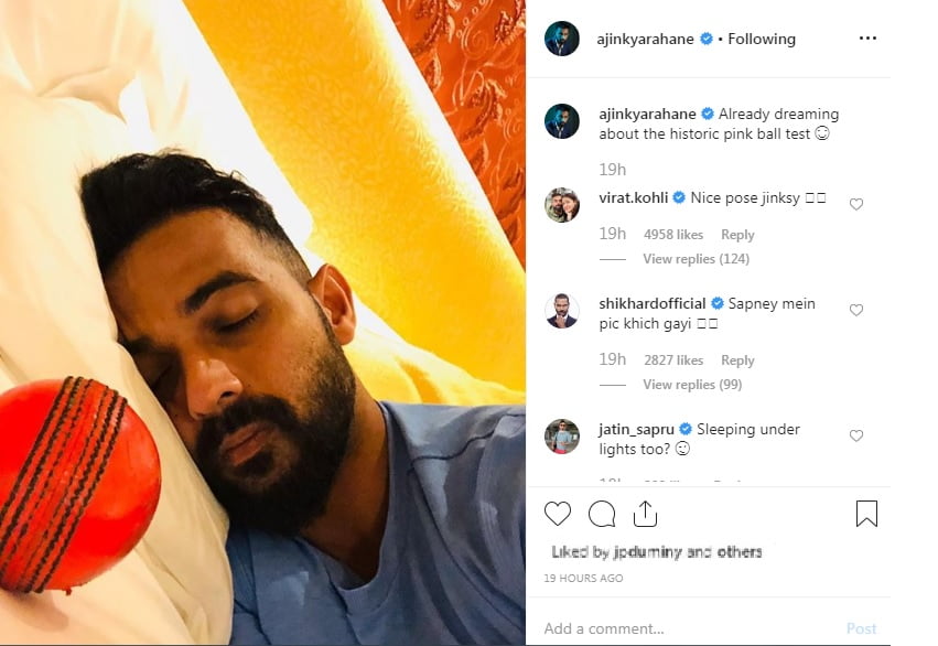 The Indian Test deputy skipper, Ajinkya Rahane cannot stop “dreaming about the historic pink ball test” is scheduled to commence on Friday at the Eden Gardens as he took to Instagram and uploaded a picture to let his feelings about the match. The Indian skipper, Virat Kohli, who will be leading the Indian team in the historic pink-ball Test, reacted to his teammate Ajinkya Rahane’s picture by commenting “Nice pose jinksy”.