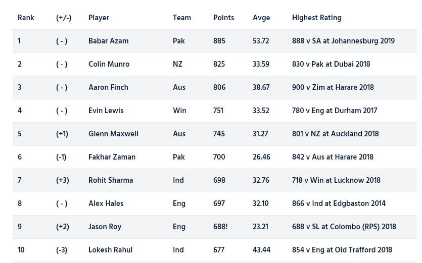 ICC Men’s T20I Batsmen Rankings: