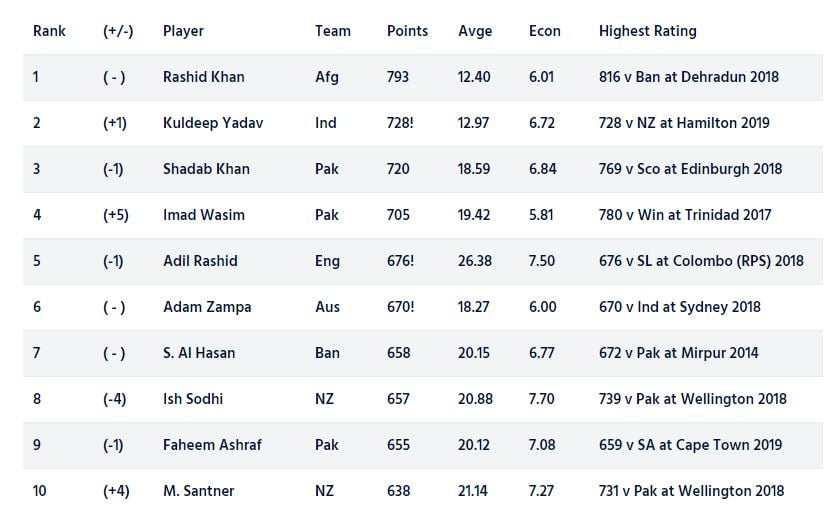 Kuldeep dismissed the well-set openers of New Zealand Tim Seifert and Colin Munro in the only match he played during the series and reaped immediate dividends. He is now only behind Afghanistan leg-spinner Rashid Khan in the table.