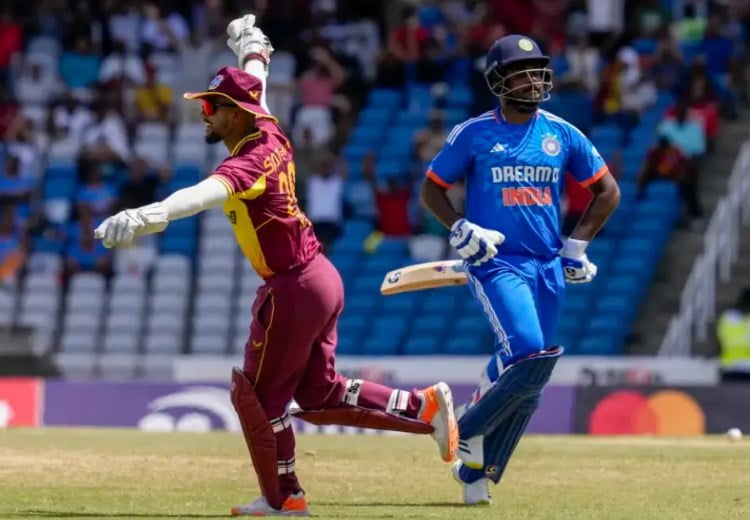 Despite the wicket, India still had hope with Sanju Samson and Axar Patel at the crease. As Axar pushed the ball toward point for a single, Samson began sprinting to complete the run. However, Kyle Mayers exhibited exceptional fielding skills from short cover.