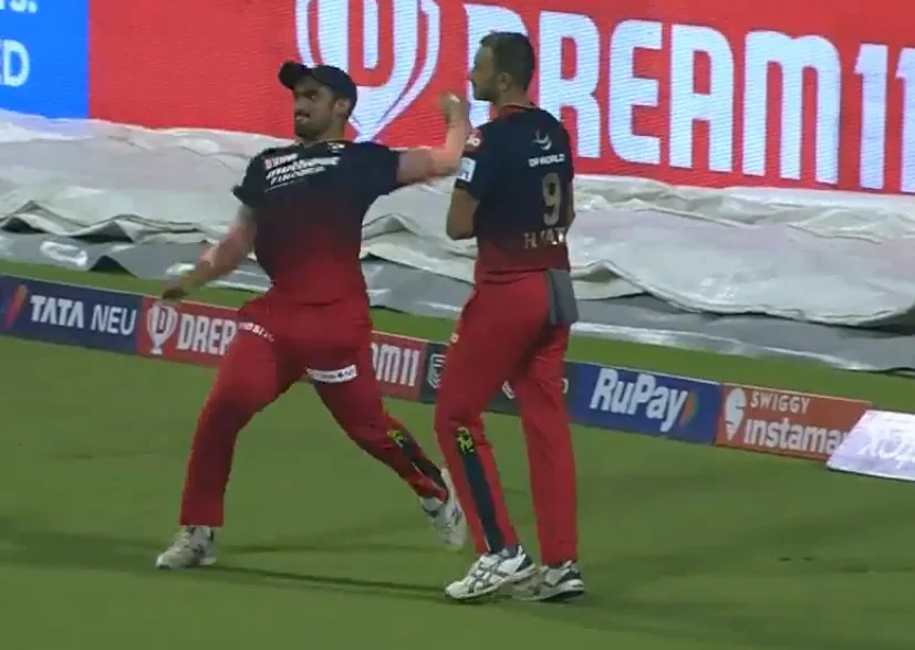 Josh Hazelwood was bowling the third ball of the second over when KL Rahul flicked it off the pads and the ball was racing towards the square leg boundary and Mahipal Lomror and Harshal Patel tried to save it. However, initially, the two fielders crashed into each other which hurt Harshal Patel then in a comedy of errors saw the ball roll towards the boundary and Mahipal Lomror needed three attempts to save the ball from going to the fence.