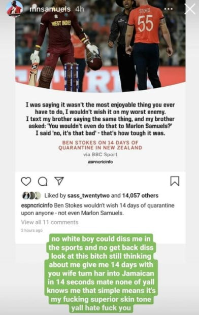 Though Stokes had taken Samuels’ name in the podcast jokingly, it didn’t go well with the Caribbean cricketer. Sharing the statements made by Stokes on his official Instagram handle story, Marlon called Stokes a b***h, followed by further disparaging remarks.