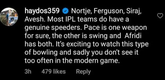 Clarifying his statement in the comment section of Crictracker’s Instagram post, Matthew Hayden wrote, “Nortje, Ferguson, Siraj, Avesh. Most IPL teams do have genuine speeders. Pace is one weapon for sure, the other is swing and Afridi has both. It’s exciting to watch this type of bowling and sadly you don’t see it too often in the modern game.”