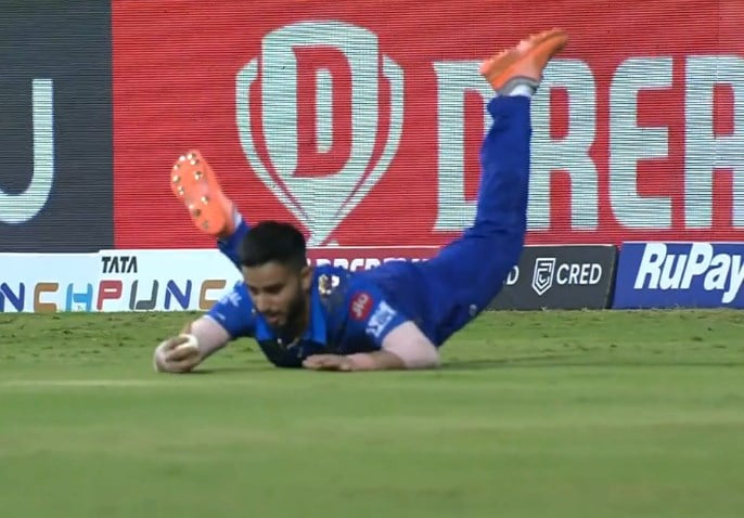 Mumbai Indians (MI) is locking horns with Sunrisers Hyderabad (SRH) in the 65th match of the Indian Premier League (IPL) 2022 at the Wankhede Stadium in Mumbai. In the first innings, Mayank Markande, who was fielding at deep backward square leg lunged forward, got his hands underneath the ball, and took a tremendous catch.