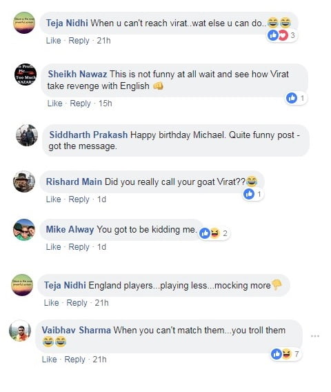 The birthday boy’s intentions weren’t wrong though it seems as he just wanted to praise the Indian skipper which he’ been doing promptly after Kohli scores a century in the ongoing Windies ODI series. After his tons in the second and third game, Vaughan used the goat’s smiley to call him the ‘Greatest of All Time’ (G.O.A.T).