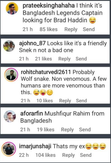 As Mitchell Johnson asked the name of the snake, fans shared their thoughts in the comment section. One of the users wrote: ‘It’s a non-venomous wolf snake’. Out of nowhere, one of the fans decides to give harsh burns to Bangladesh cricketers. ‘I think it’s Bangladesh Legends Captain looking for Brad Haddin (laughing emojis)’, the fan wrote. Here are some reactions of fans.