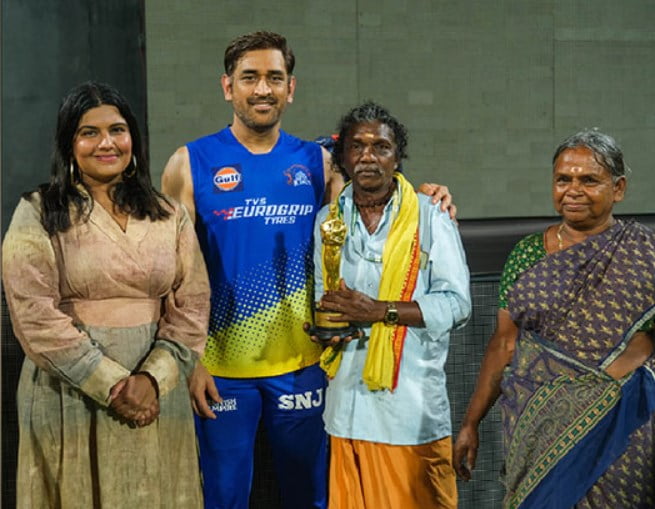 Chennai Super Kings (CSK) skipper MS Dhoni felicitated the Oscar-winning team of ‘The Elephant Whisperers’ at the MA Chidambaram Stadium in Chennai. Dhoni took the onus of meeting the real-life heroes- Bomman and Bellie, the elephant caregivers and gifted them with a special CSK jersey.