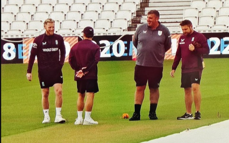 BEN STOKES AND MCCULLUM WITH PITCH CURATOR LEE FORTIS