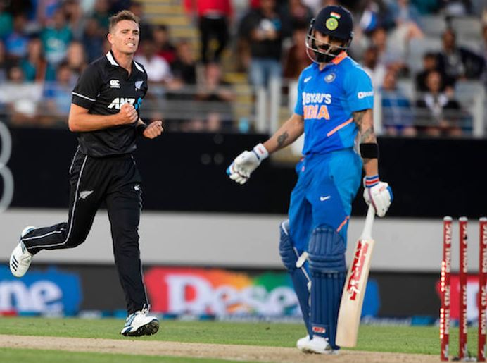 New Zealand got off to a flyer with the ball with quick wickets of openers Mayank Agarwal and Prithvi Shaw, before Southee castled Kohli. KL Rahul and Kedar Jadhav also failed to prove their worth. Similar to the last ODI, Shreyas Iyer scored his seventh ODI half-century before being dismissed by Hamish Bennett.