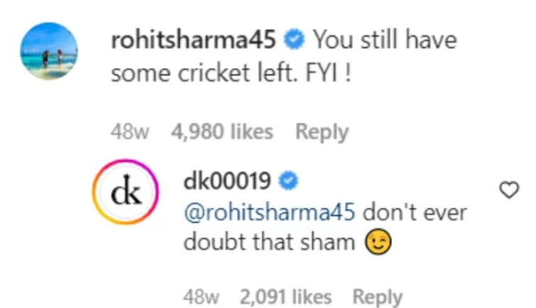 After his heroics from the recently concluded game, his conversation with Rohit Sharma, from 2021, has resurfaced on social media. Dinesh Karthik had posted a picture of himself, captioning it “Just me being me” with the ‘blessed’ emoticon. To which Rohit Sharma had replied, “You still have some cricket left. FYI!”. Karthik responded to Sharma’s message and said “Don’t ever doubt that sham” with the wink emoticon.
