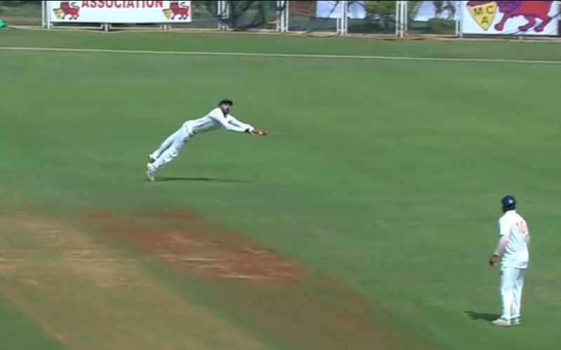 Paras Dogra, positioned at mid-off, sprang into action, running to his left and executing a spectacular one-handed catch while in mid-air. This stunning fielding effort resulted in Rahane’s dismissal for just 16 runs off 36 balls, adding to Mumbai’s struggles.