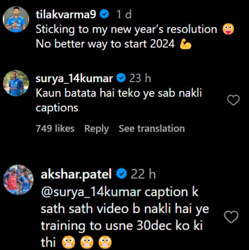 Suryakumar responded in the comments, “Kaun batata hai teko ye sab nakli captions (Who gives you these fake captions).” Axar chimed in, stating, “Caption k sath sath video b nakli hai ye training to usne 30 dec ko ki thi (Apart from the caption, the video is also fake as he had recorded it on December 30).”