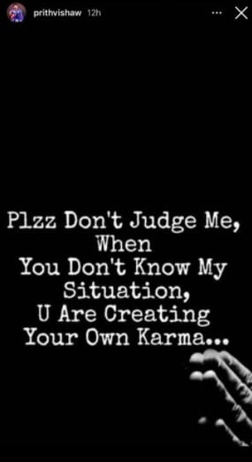 As the world and media give opinions about Shaw, with the social mediua and internet full of news around Shaw, the youngster replied and warned the people about Karma. Prithvi Shaw uploaded an Instagram story in which he wrote, “Please don’t judge me when you don’t know my situation. You are creating your own Karma”.