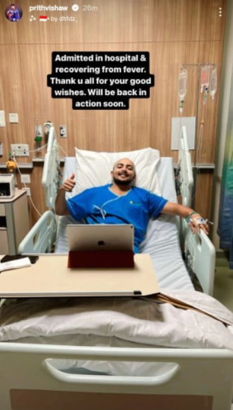 Captioning the story Prithvi Shaw posted on his Instagram account, he wrote: “Admitted in hospital and recovering from fever. Thank you all for your good wishes. Will be back in action soon.”