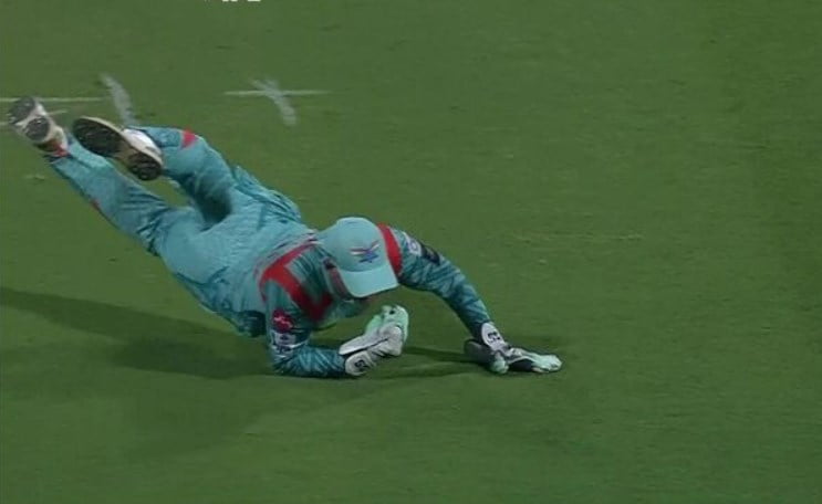 Courtsey: outstanding catch of a flying inside edge by the man of the moment, @QuinnyDeKock69 😳👏#IPL2022 @ICC #LSGvsKKR