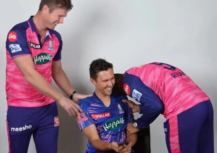 Ahead of their next game against the Lucknow Super Giants, the RR players were seen having some fun, with Riyan Parag, Daryl Mitchell, and James Neesham were seen pull off a prank on pacer Trent Boult. While Boult thought that he was being interviewed by the RR social media team, it was actually Parag, Mitchell, and Neesham, who were pulling the strings from their room.