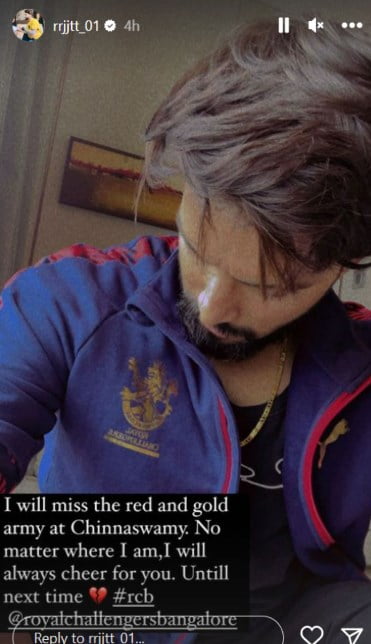“I will miss the red and gold army at Chinnaswamy: No matter where I am, I will always cheer for you. Until next time,” Rajat Patidar shared on his Instagram handle.