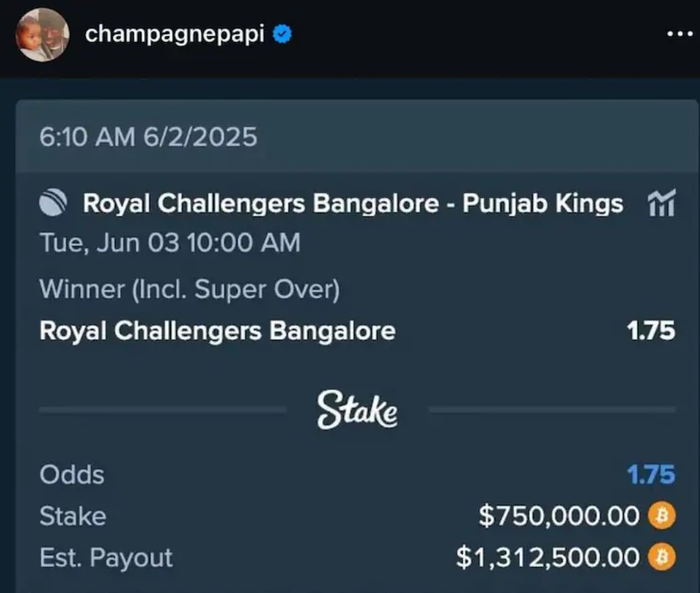 Drake’s bet was placed via the crypto-betting platform Stake, a site he frequently uses for his high-stakes wagers. If RCB goes on to win the final, the rapper stands to pocket a whopping ₹11.23 crore in returns. The move has triggered a mix of excitement, curiosity, and apprehension, especially among Indian fans who are all too familiar with the notorious “Drake Curse.”