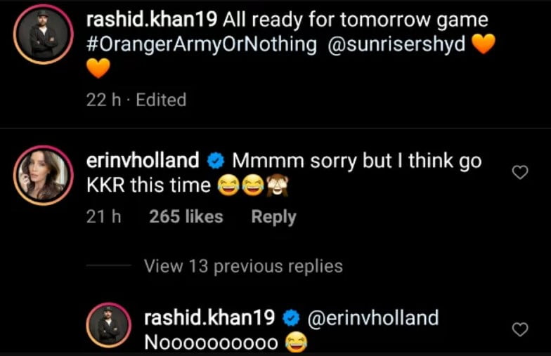 And, this post caught the attention of Ben Cutting’s wife Erin Holland. Holland commented on Rashid’s post and stated that she will be supporting KKR on 11th April 2021. And to that, Rashid has replied with a huge ‘No.’ Interestingly, Holland’s husband Cutting is playing for KKR in IPL 2021. Here is the conversation between Rashid Khan and Erin Holland: