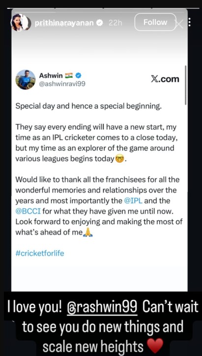 However, Ravichandran Ashwin may not be stepping away from cricket entirely. His wife, Prithi Narayanan, hinted at new beginnings in a heartfelt message on social media. “I love you @rashwin99! Can’t wait to see you do new things and scale new heights,” she wrote, sparking speculation about Ashwin’s future beyond the IPL.