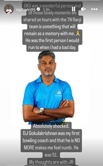Ravichandran Ashwin’s Instagram story read, “GKS was a wonderful person, and all those lovely moments we shared on tours with the TN Ranji team are something that will remain a memory with me. He was the first person I would run to when I had a bad day.”