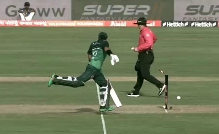 In the 24th over, Rizwan attempted a quick single by pushing the ball towards the covers. However, Dipendra Singh Airee, positioned at covers, swiftly gathered the ball and accurately struck the stumps. In an astonishing turn of events, Rizwan found himself with his bat and both feet suspended in the air, as he contorted to evade the ball, ultimately leading to his dismissal.