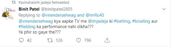 Replying to Sehwag, a Twitter user blamed him for overlooking Jadeja’s fine performance. “@virendersehwag kya aapke TV me @imjadeja ki #batting, #bowling aur #fielding ka performance nahi dikha??? Ya phir so gaye the???,” (Virender Sehwag didn’t your TV show Ravindra Jadeja’s performance with the bat, ball and on the field? Or were you sleeping?). The fan’s comment was retweeted by Jadeja.