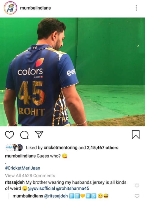 In the meantime, Ritika Sajdeh, to whom Rohit has been married since December 13, 2015, found it a weird that his brother (Yuvraj) wore Rohit’s jersey. Ritika replied to one of the posts and wrote, “My brother wearing my husbands’ jersey is all sorts of weird.”
