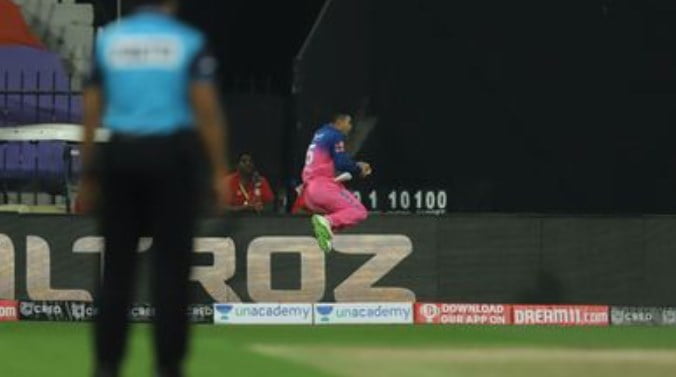 During the fifth ball of Shreyas Gopal’s first over of the match, Agarwal smashed the floated delivery towards long-on which looked six-bound. However, Parag leaped up and caught the ball and managed to have the presence of him to throw the ball inside the ball while he himself fell over the boundary ropes.