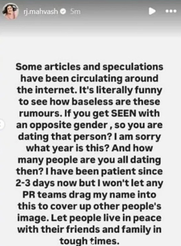 However, Mahvash has now set the record straight. In a fiery Instagram story, she dismissed the dating rumours, calling them laughable and hinting at PR strategies being used to involve her in the controversy. She expressed frustration over the way society jumps to conclusions when a man and woman are seen together, emphasizing the need to respect personal boundaries.