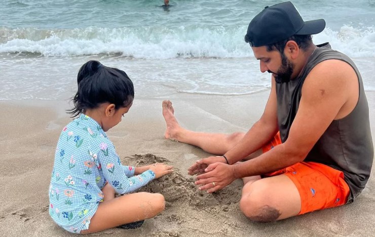 Following the triumph, Rohit Sharma shared a couple of heartwarming pictures of himself and Samaira having fun on the beach. The photos captured the duo engaging in sand artistry, with Rohit dressed in a charcoal tank top and orange shorts, exuding a cheerful vibe. Samaira, dressed in a charming flower-patterned outfit, was all smiles alongside her doting father.