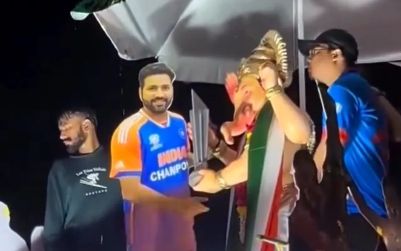 On the vibrant occasion of Ganesh Chaturthi, Indian cricket fans staged a heartwarming tribute by recreating a memorable scene from India’s second T20 World Cup victory. The celebration featured an imaginative display where a cut-out of Indian captain Rohit Sharma holding the T20 World Cup was placed alongside the idol of Lord Ganesh, infusing the festival with a touch of cricketing glory.