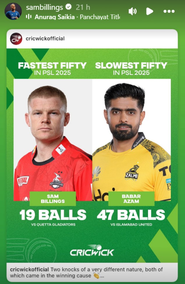 In sharp contrast, Sam Billings, playing for Lahore Qalandars, smashed the fastest fifty of the season, getting there in just 19 deliveries against Quetta Gladiators. The striking difference between their performances was highlighted on Instagram by a popular cricket page, and Billings cheekily reshared the post on his story.