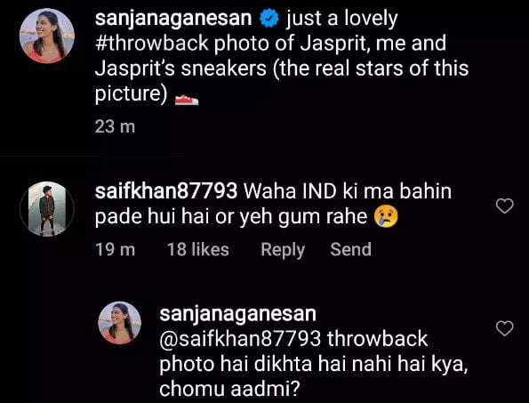 Reportedly, the user dropped a comment criticizing the duo for holidaying when India suffered a loss on the cricket field. Sanjana gave a fitting reply, calling out the user for the unnecessary remark. “Throwback photo hai, dikhta nahi kya chomu aadmi (It’s a throwback photo, can’t you see, you fool,” Sanjana Ganesan retorted.