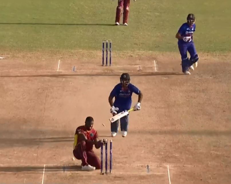 Romario Shepherd was at the bowler’s end and he was side-on to the left of the stumps on one knee, but the ball went off the shin to the stumps. The umpire wasn’t sure how the bails were dislodged as the ball hit the stumps or if Shepherd’s bent right shin made contact is the question. The ball was parried and made direct contact, so Sanju Samson had to make his way back to the pavilion.
