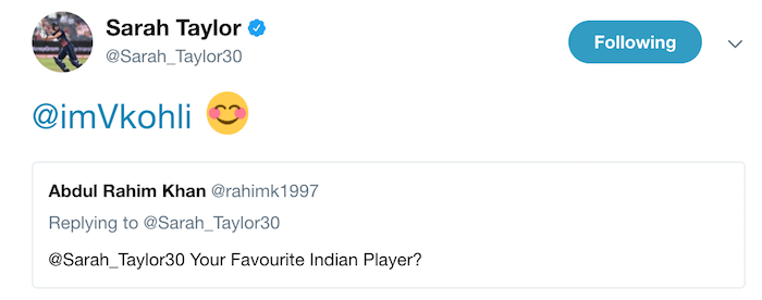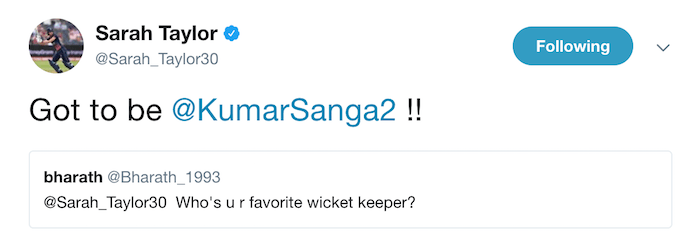 One of her fans asked Taylor about her favorite wicketkeeper to which Sarah replied to none other than “Got to be Kumar Sangakkara !!”