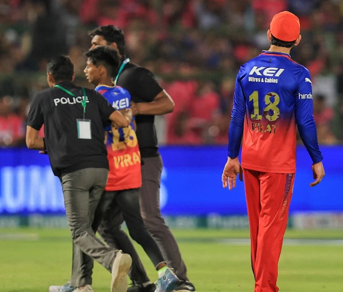 The IPL encounter between Rajasthan Royals (RR) and Royal Challengers Bangalore (RCB) witnessed a momentary halt on Saturday (Apr 6) due to a security breach. A fan breached the security cordon and sprinted onto the field, heading straight for Virat Kohli. Kohli, initially startled, allowed the fan to embrace him before stewards and security officials swiftly escorted the intruder out of the playing arena.