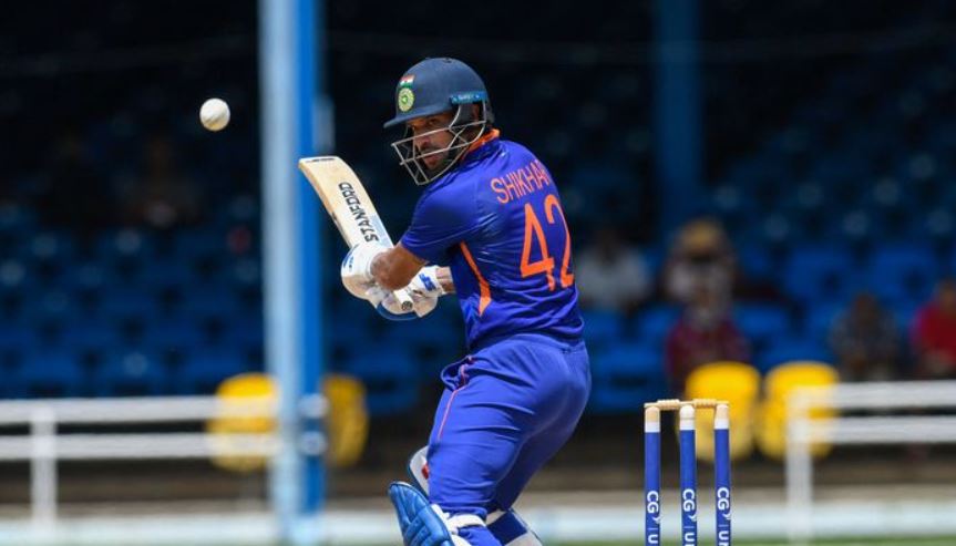 Gudakesh Motie was bowling the 34th over of the innings and he bowled a slow delivery wide outside off stump on the fourth ball. Shikhar Dhawan was on strike and he was looking to play a square drive, but the ball took an outside edge and went through the air. Shamarh Brooks was fielding at point and the ball was going away from him. However, he caught a sensational catch with a diving effort to his right and dismissed Dhawan on 97 providing the hosts with a crucial breakthrough.