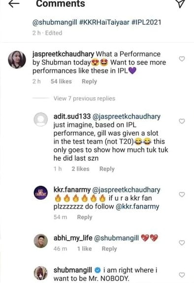 The KKR opener, Shubman Gill had strong words to reply to the social media users who had made disparaging comments on the cricketer’s batting style in the comments section of the post by Gill’s IPL team Kolkata Knight Riders. Gill commented: “i am right where i want to be Mr. NOBODY.”