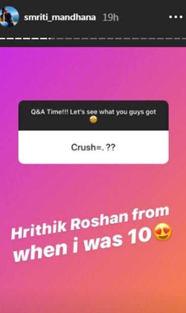 She also revealed her crush. Mandhana responded that Bollywood star Hrithik Roshan is her crush ever since she was 10 years old.
