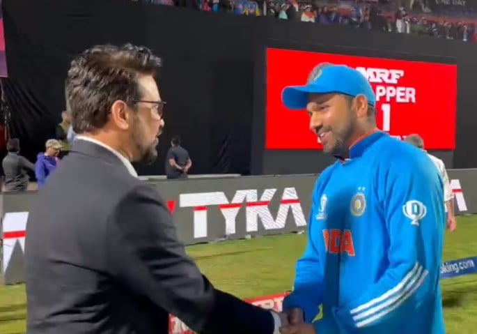 Sports minister Anurag Thakur was present at the HPCA Stadium in Dharamsala as India defeated New Zealand for their fifth win in a row in the ongoing ICC Cricket World Cup 2023. He later shared a clip of his meeting with India captain Rohit Sharma after the hard-fought win. After a close contest, Thakur and Rohit hugged each other and exchanged pleasantries.