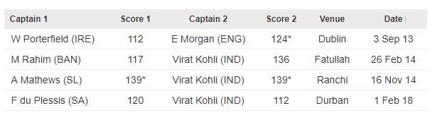 - In the history of ODI cricket, it was only the 4th incidence when both captains scoring hundreds in the same ODI, all of them have come after 2013. Three of the four instances involved India and all the three times they were scored by Kohli.